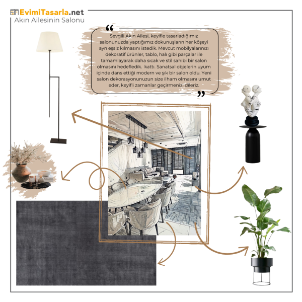 "Mevcut mobilyalarımı kullanarak salonumda farklı bir hava yaratmak istedim, EvimiTasarla.net Aksesuar Seçimi paketi sayesinde yepyeni bir salonum var gibi hissediyorum."