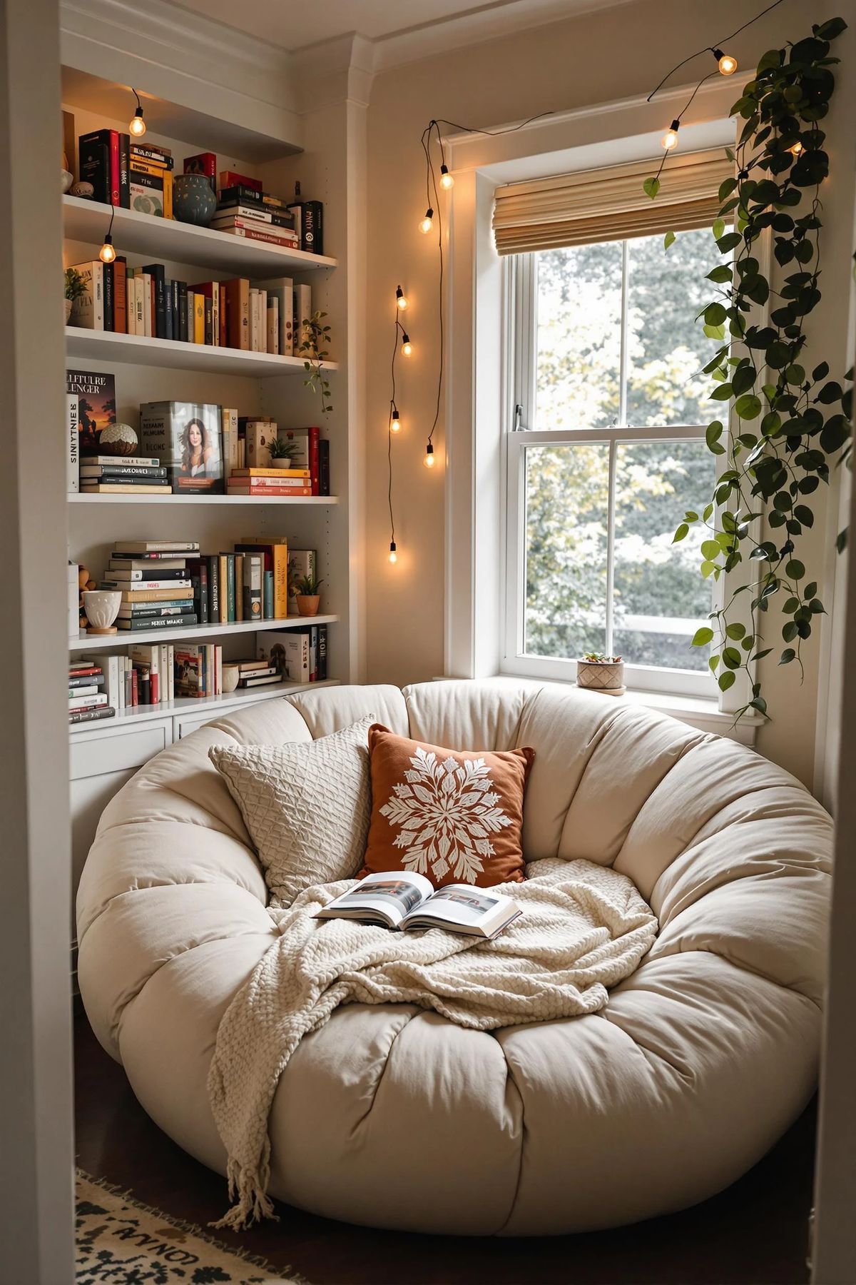 - Ana bileşenler: rahat bir tekli koltuk, el lambası, tekstil (şal, minder), küçük sehpa, kitap rafı